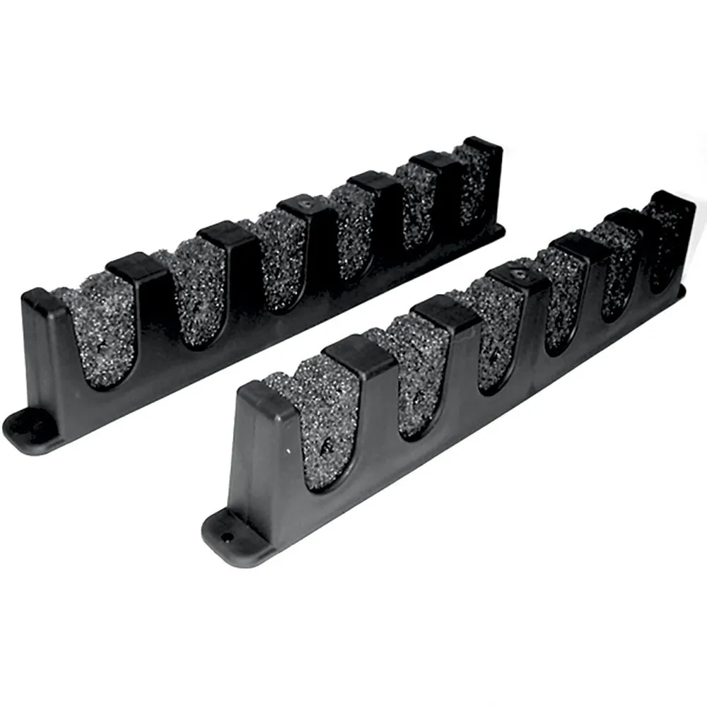 Molded frame with slit closed-cell foam inserts hold up to six rods safely and securely.